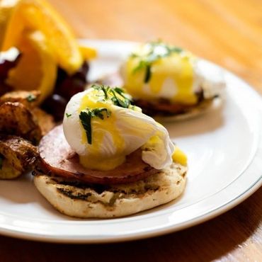 Poached Eggs, Canadian Bacon, and Hollandaise Sauce on a English Muffin. Served with Home Fries and Salad.